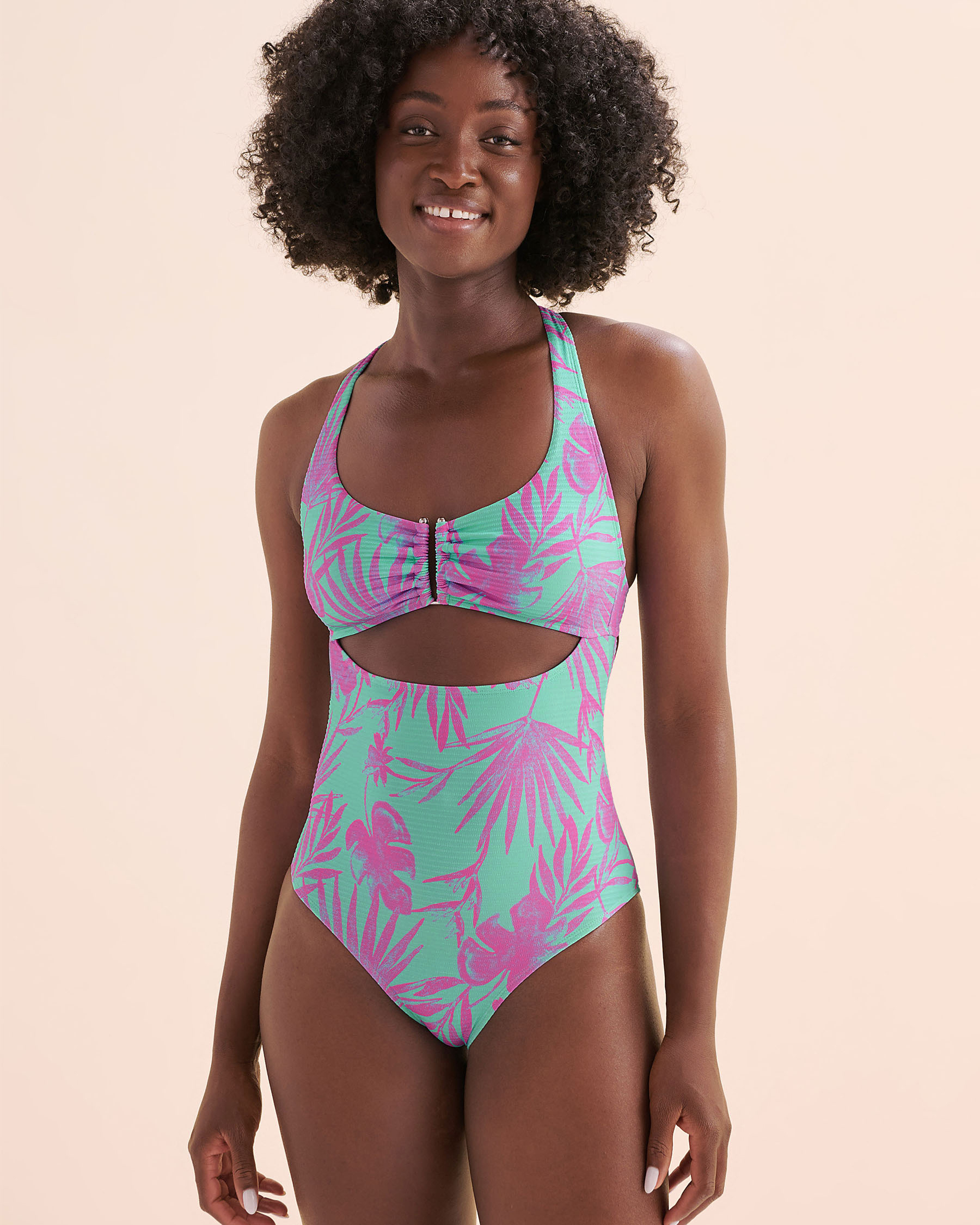 Elegance meets versatility in this one-piece swimsuit. Designed without underwire for optimal comfort, it features removable padding and an adjustable back tie for a personalized fit. Wear it in a classic or crisscross style to suit your mood. The textured fabric enhances your silhouette, while the green and purple leaf print adds a refined tropical touch.