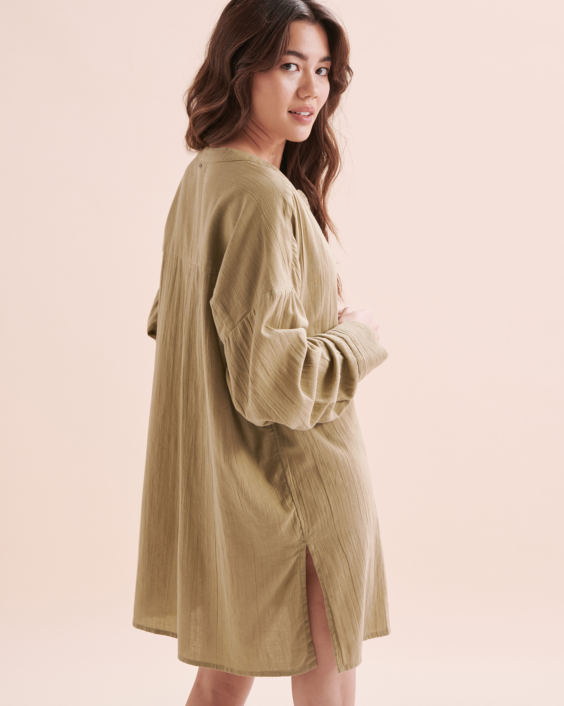 The Belizin Shirt by O'Neill is a beach necessity. This pale khaki green top can be worn over a bathing suit, as a summer dress, or as a top. Its long sleeves can be rolled up. Its deep V-neck adds a touch of style to a classic look.