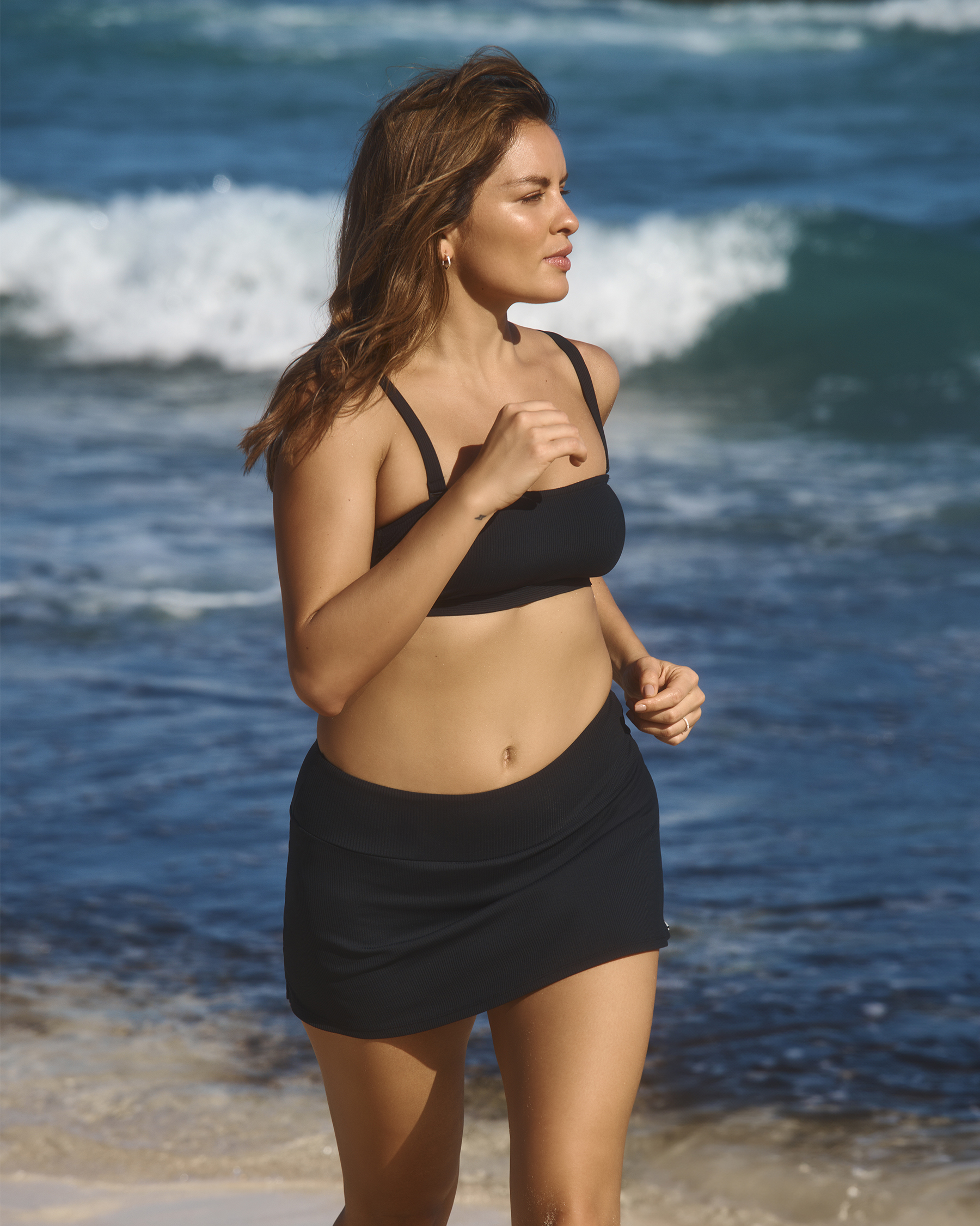 The high-waisted swim skirt offers full coverage, a practical inner pocket, and a modern silhouette thanks to its clean cut and lined ribbed fabric.