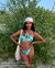 Get ready to turn heads, the Chic Villa bikini top in bright blue with a playful, sun-kissed orange fruit print is definitely not here to go unnoticed. Its ultra-chic high neckline and delicate keyhole detail adorned with a golden ring give it a truly glamorous vibe.