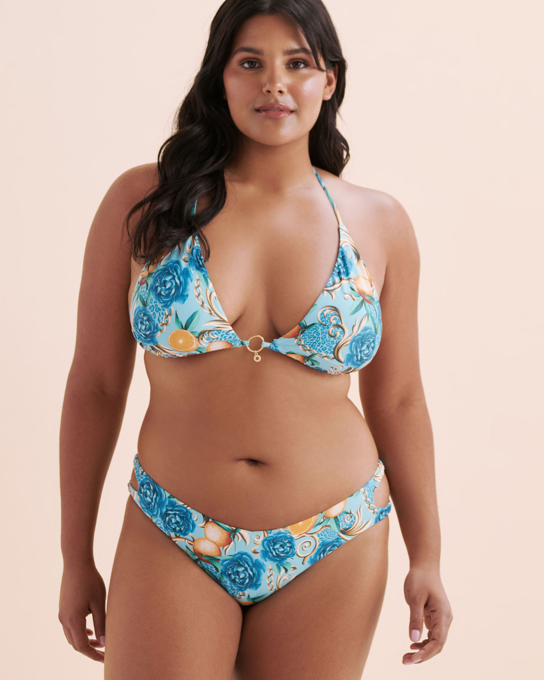 Fruity, fun and irresistibly stylish to spice up your beach look. This low-rise Chic Villa tanga is a refreshing burst of energy with its vibrant blue, highlighted by a playful orange fruit pattern that invites good vibes. The subtly cut golden side rings and gathered details at the back add a flirty touch.