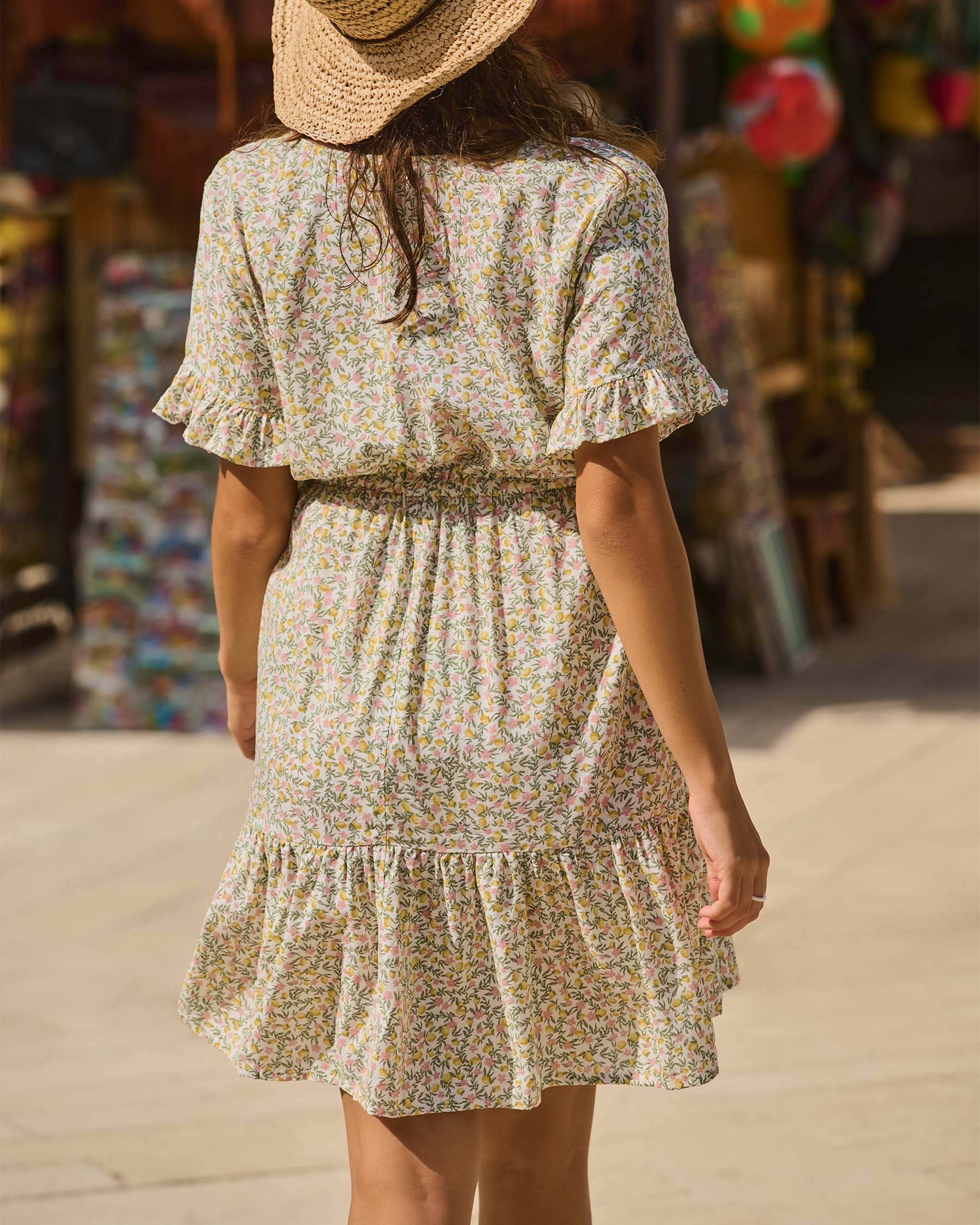 The viscose ruffle dress is a real ray of sunshine in your wardrobe! With its short sleeves and delicate gathers, it gives a romantic vibe. The drawstring at the waist lets you cinch it perfectly to accentuate your silhouette, while the button-front closure adds a gentle touch. The garden pattern evokes sunny days amid blooming flowers, while the ruffles bring an elegant finish.