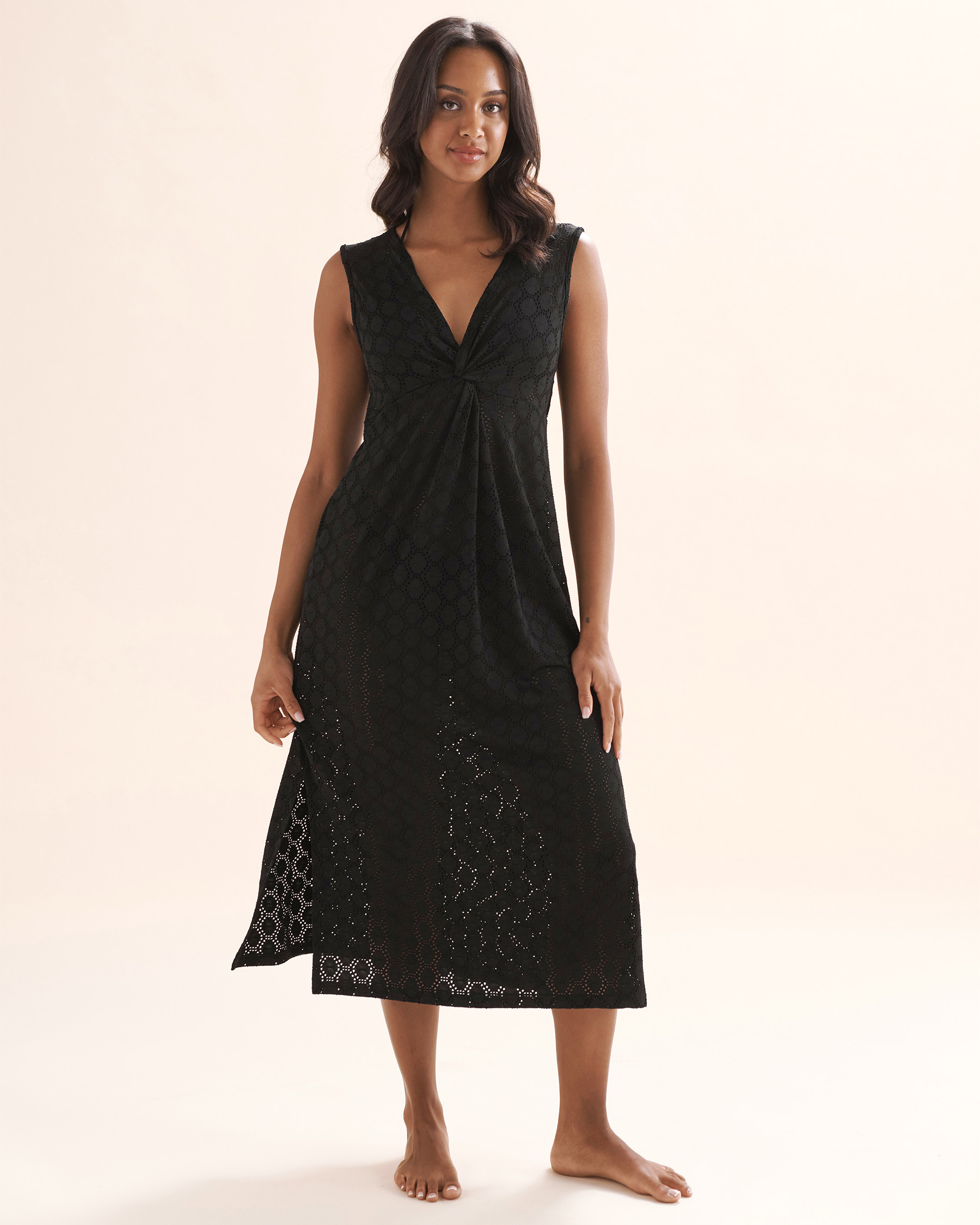 Embrace a modern look with this eyelet long dress! Sleeveless and featuring side slits, its fluid cut perfectly hugs your silhouette, while the eyelets add a bold touch. Perfect for a chic evening or a casual outing, it will become your new little black dress.