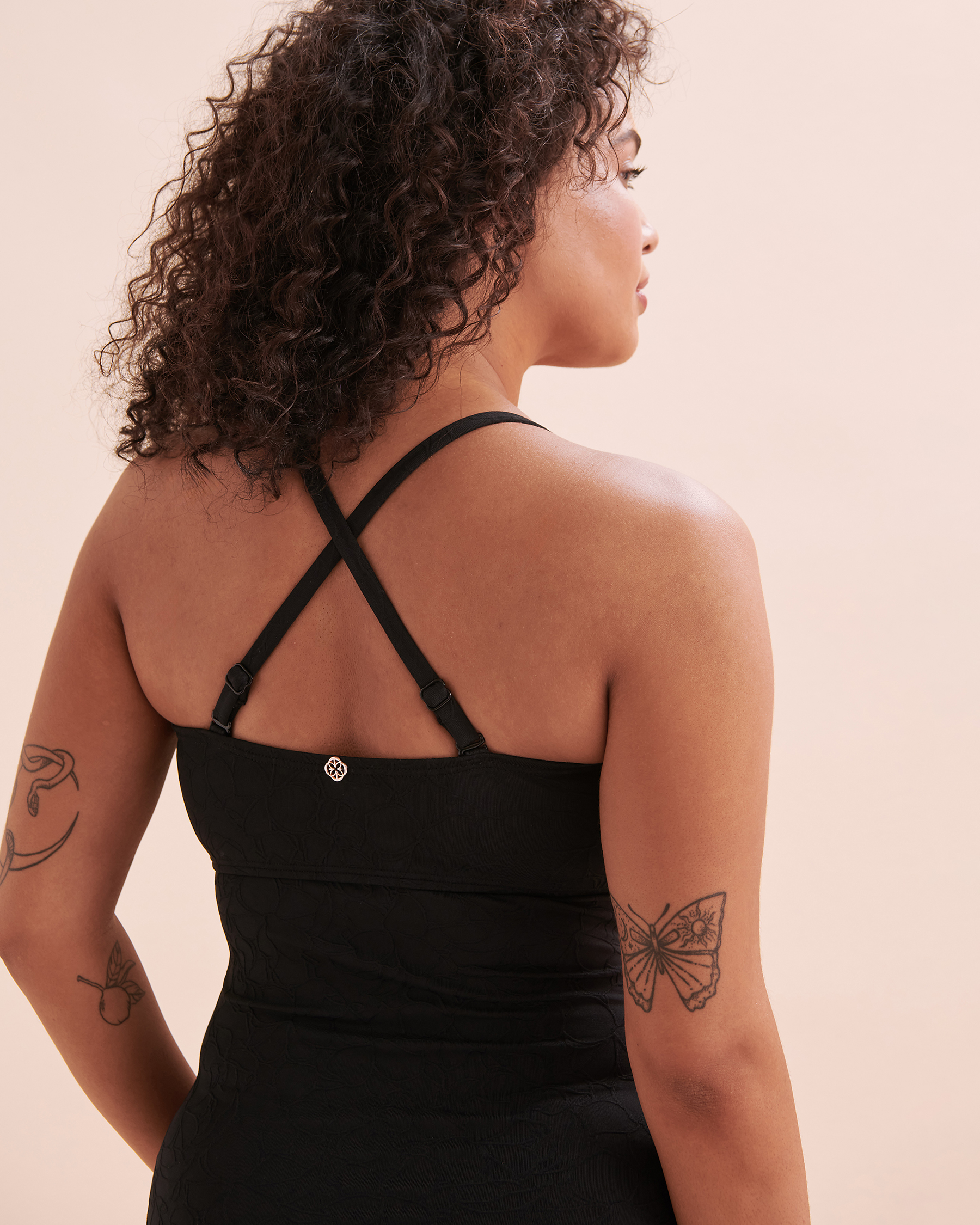 Sometimes a tankini is all you need, and Turquoise has the perfect one for you. This black swim top has adjustable and convertible straps which will keep you feeling secure all day. Its pullover style and front string are a unique way to diversify your bathing suit collection!