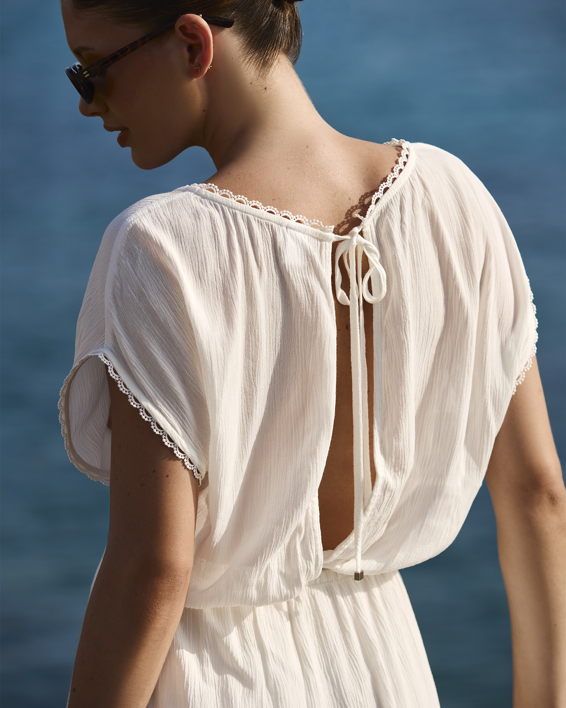 The essence of beach style, sewn with ease. This white maxi dress embodies a certain delicacy. Its lace hem along the neckline and sleeves adds a natural, feminine touch.