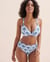 This blue and white palm mosaic plunging bikini top features a delicate front drape that beautifully enhances the neckline, while the moulded underwire cups provide perfect support and comfort for fuller busts. The tie back closure adorned with playful pom-poms adds a sun-kissed touch of elegance, capturing the effortless charm of the Greek islands. Designed to take you from sun lounger to sunset in timeless style.