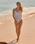 This one-piece swimsuit with its blue and white palm mosaic print evokes the sunlit alleyways of Mykonos and carefree afternoons by crystal-clear waters. The gathered front gently flatters the figure, while the mesh-lined bra provides lasting support and comfort throughout the day. We’re in love with the tie-back detail, finished with playful pom-poms that add a boho-chic twist to this perfectly structured silhouette.
