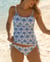 Ready to conquer the beaches? This blue and white cami bikini top with a palm tree print is a true invitation to relaxation. Its elastic double-lined bra provides perfect support staying ultra-comfortable, while the side ruching enhances the silhouette with a touch of refinement. The adjustable side cords adorned with pom-poms add a bohemian flair and the adjustable straps give you total freedom to style it your way. This top pairs perfectly with a mid-rise bikini bottom, creating an elegant silhouette.