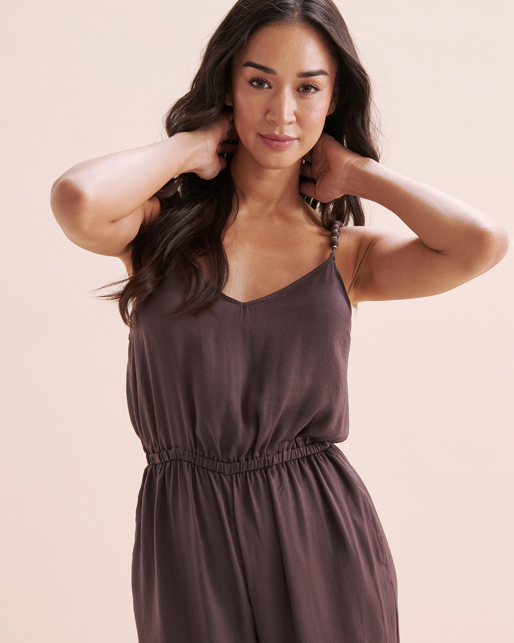 The Santemare satin jumpsuit exudes elegance and sophistication. With its sleeveless design and flattering V-neck, it unveils a subtly sensual silhouette. The elastic waistband highlights the waist for a refined look, while the adjustable straps, adorned with golden jewelry, add a luxurious touch to this timeless piece. Discreet pockets bring a practical and modern element to this chic outfit. In a soft, luminous cranberry brown shade, this jumpsuit is perfect for any occasion, whether relaxing by the pool or dressing up for an elegant outing. Santemare presents a product that blends comfort, style, and sophistication, ideal for making a statement wherever you go.