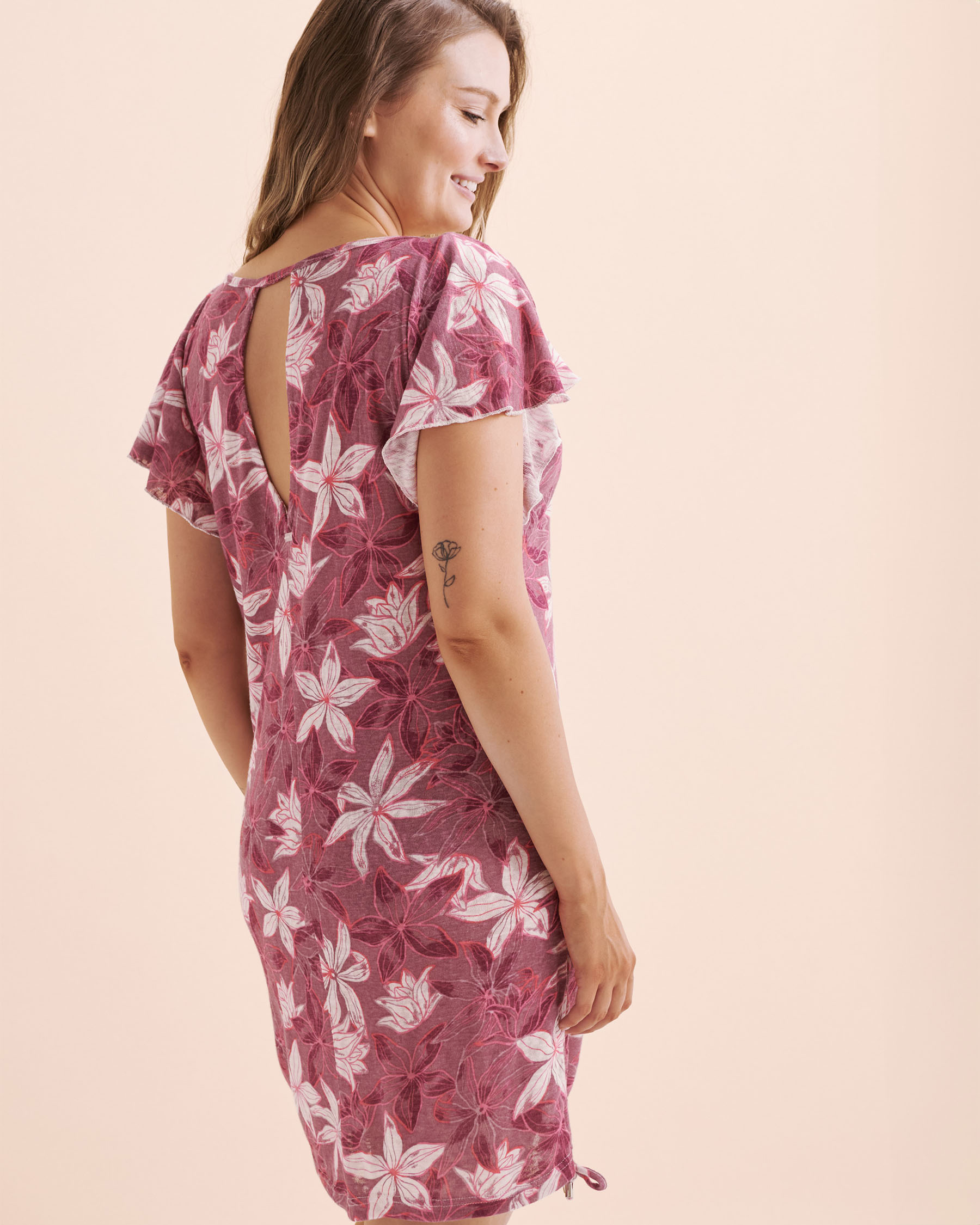 Feel the light breezes with this knitted tunic. It's a beautiful plum colour enhanced with a delicate pink and mauve floral pattern. The adjustable cords, adorned with cylindrical silver metal beads, modulate its length while an open cutout at the back subtly reveals the skin. This tunic slips easily over your favourite bikini, we especially love it with high-waisted bottoms and a triangle top.