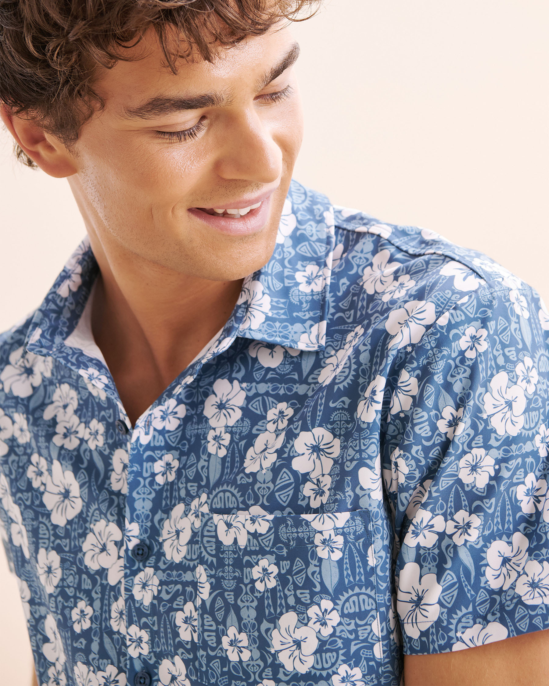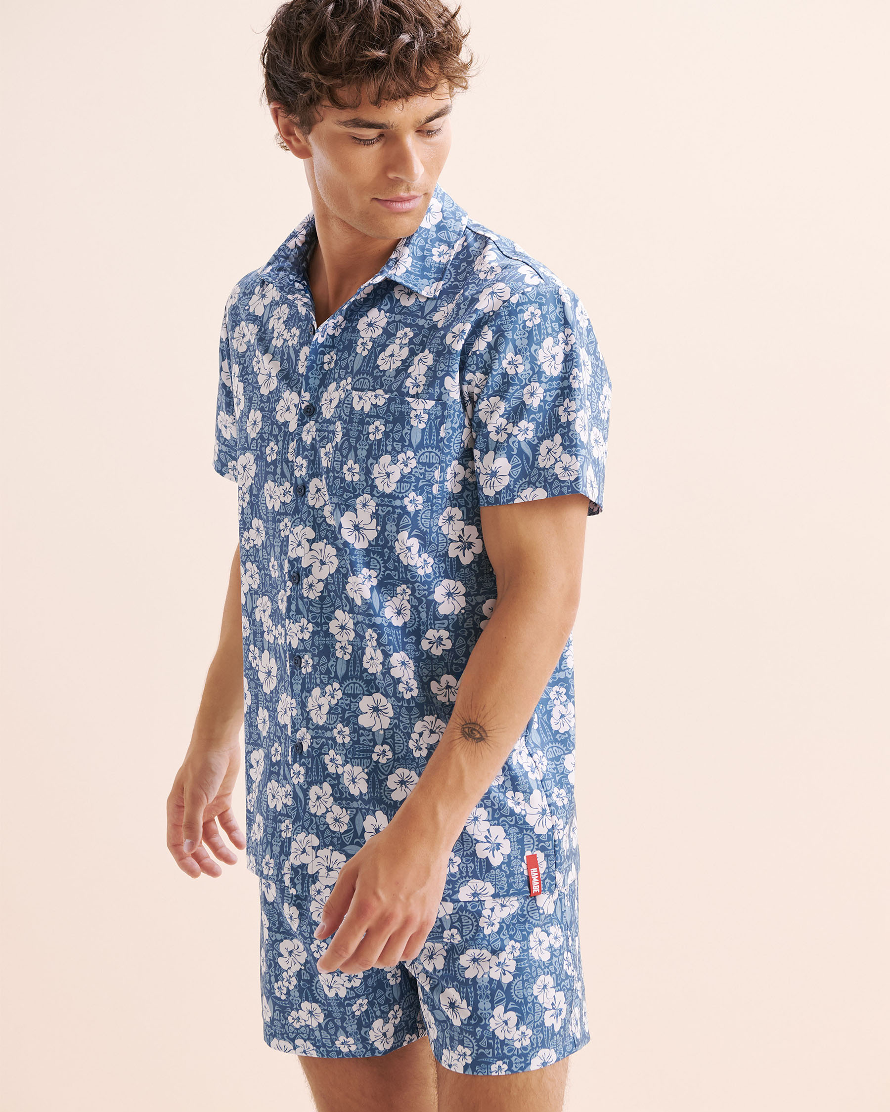 The call of the ocean has never been stronger. This short-sleeved shirt, with its white hibiscus print on a blue background and Polynesian-inspired pattern, instantly transports you to a dream beach, no passport required. Designed for total freedom of movement, it features a front pocket to keep your essentials close and a relaxed fit that pairs perfectly with your favourite volley swimsuit. The result? Effortless style with maximum impact.