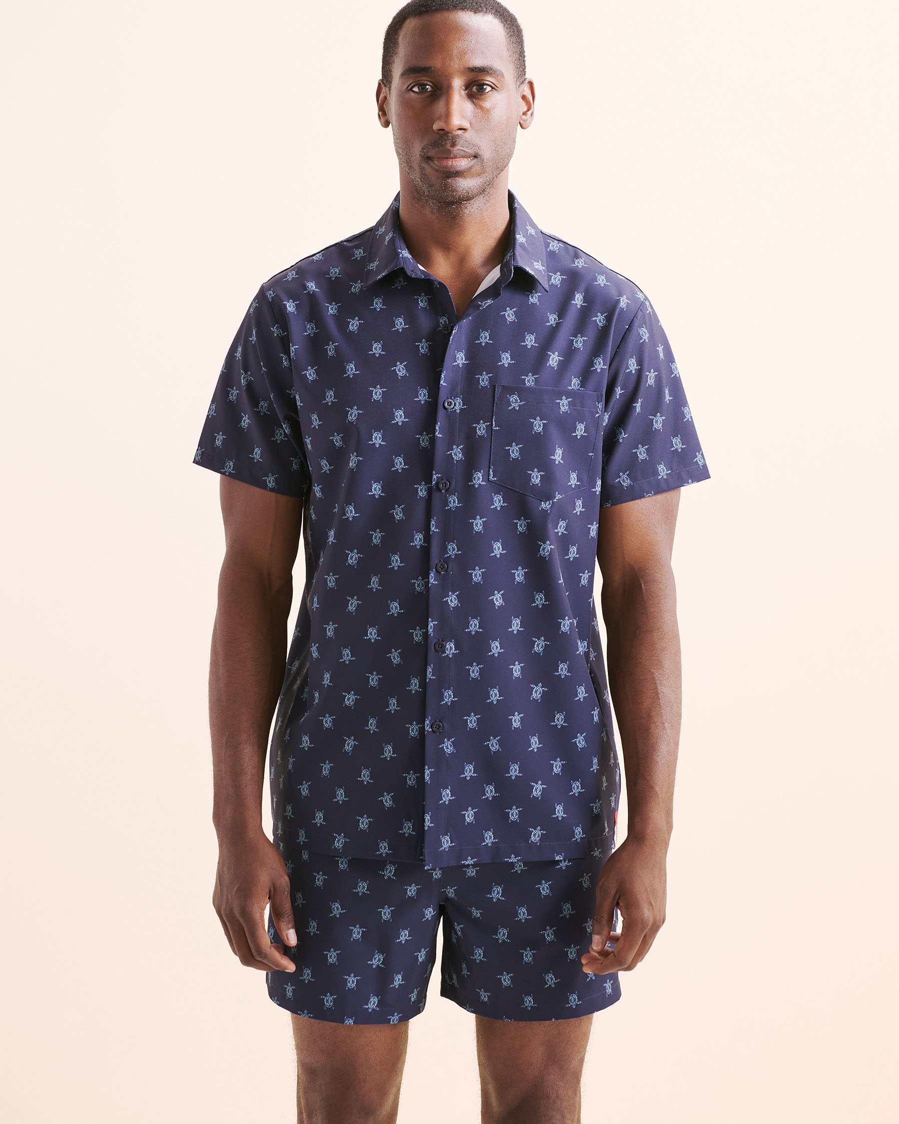 Make a splash under the sun with this short-sleeve shirt, a burst of cool made for summer. A scene of swimming turtles stands out against an azure background, evoking the ocean and making us want to dive right in. Its laid-back fit, buttoned neckline with detailed buttons, and front pocket add the relaxed vibe we all love. Wear it open or closed with a volley swimsuit for a look full of attitude.