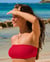 This textured smocked bandeau bikini top is all you need to shine under the sun. Its strapless design guarantees optimal comfort. With its open back and keyhole detail, it adds a bold touch. The textured fabric gives a sophisticated finishing touch and its red colour adds an irresistible glow.
