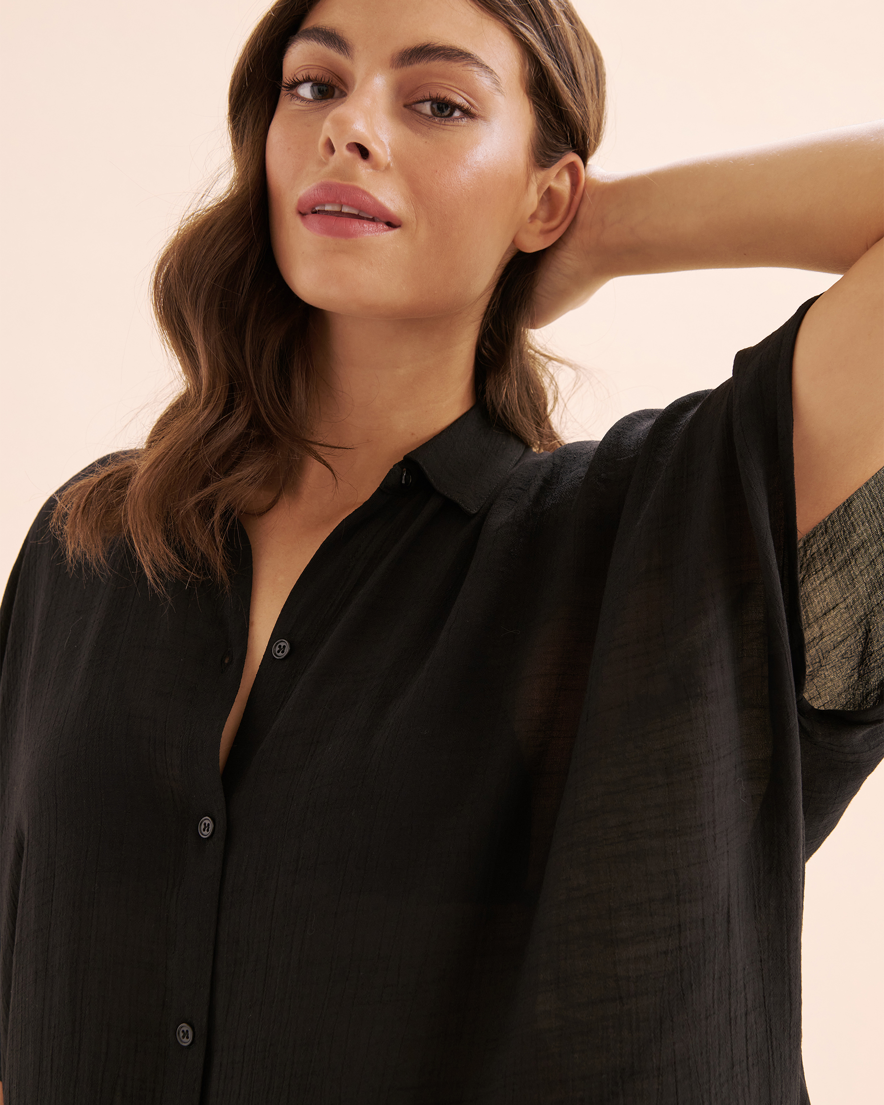 Deep black, a flowing cut and airy voile, this caftan redefines sophistication with refined simplicity. A timeless piece to keep season after season, because true style never goes out of fashion.