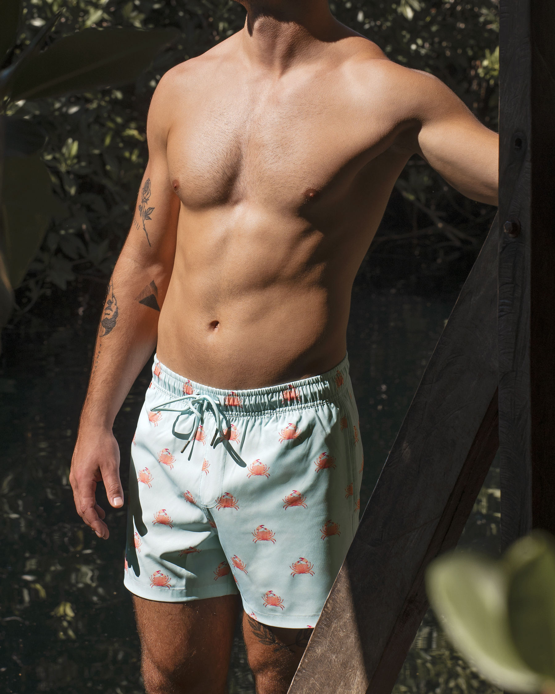 Gear up for your beach adventures with this dynamic volley swimsuit! The Volley Swimming Short combines sporty style with ultimate functionality! Featuring an adjustable elastic waist cord with a drawstring side and back pockets and a quick-dry fabric it’s designed for those who love beach volleyball and water activities. The inseam of 4.5" provides the perfect length for unrestricted movement while the inside mesh lining ensures comfort. With its vibrant blue crab print this short offers a fresh and fun look that’s perfect for the summer.