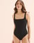 Opt for a timeless look with the Walk The Line Square Neck One-Piece Swimsuit! This sleek swimsuit features a flattering cut that enhances your silhouette. Its square neckline, both in the front and back, gives it a classic style. The ribbed fabric and recycled polyester blend add a modern, eco-friendly touch to your outfit. Easy to slip on, this black swimsuit will become a must-have in your beach collection.