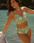 Quand la coupe rétro rencontre la modernité, cela donne ce bas de bikini taille haute au charme indiscutable. Le drapé froncé à l’avant est un détail tout en subtilité. La doublure en filet assure maintien et sa couvrance totale au dos offre une allure assumée. Le motif mosaïque aux tons vert et beige évoque une sérénité naturelle, une signature esthétique propre à Turquoise Couture. Ce modèle est une ode à la féminité mature.