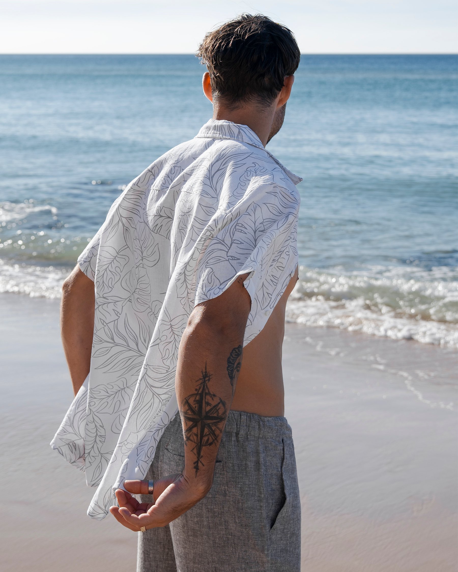 Cette chemise à manches courtes arbore un motif tropical gris qui évoque les vacances, tout en restant élégant. Confectionnée dans un mélange respirant de coton et de lin, elle est idéale pour les journées chaudes. Son encolure boutonnée, sa fermeture à l’avant et sa poche plaquée sont les parfaits détails pour être confortable.