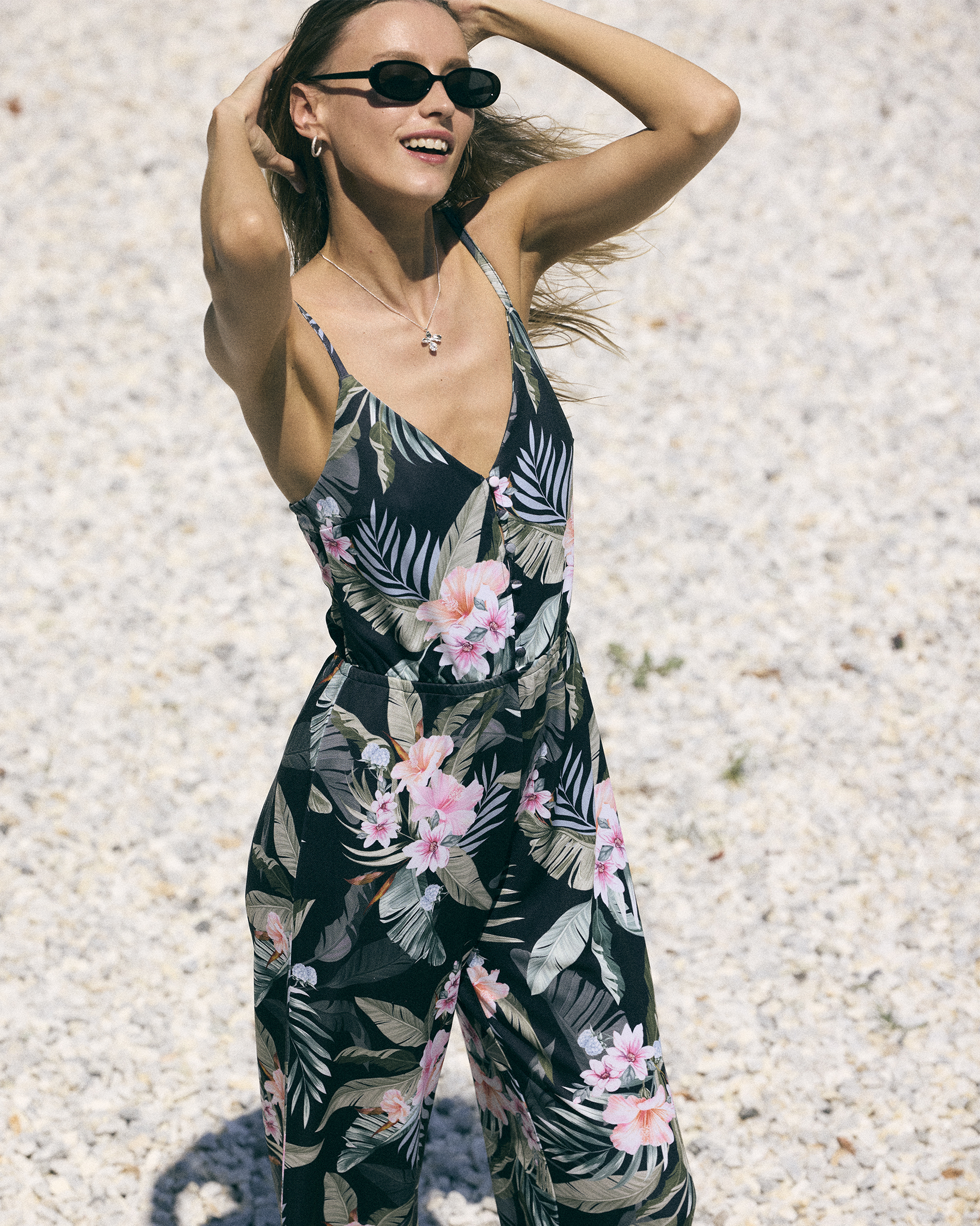 Portez l'élégance tropicale au quotidien avec cette combinaison à fines bretelles qui séduit par son imprimé tropical évoquant les paysages luxuriants des destinations ensoleillées. Elle offre un confort optimal tout au long de la journée avec ses bretelles ajustables.