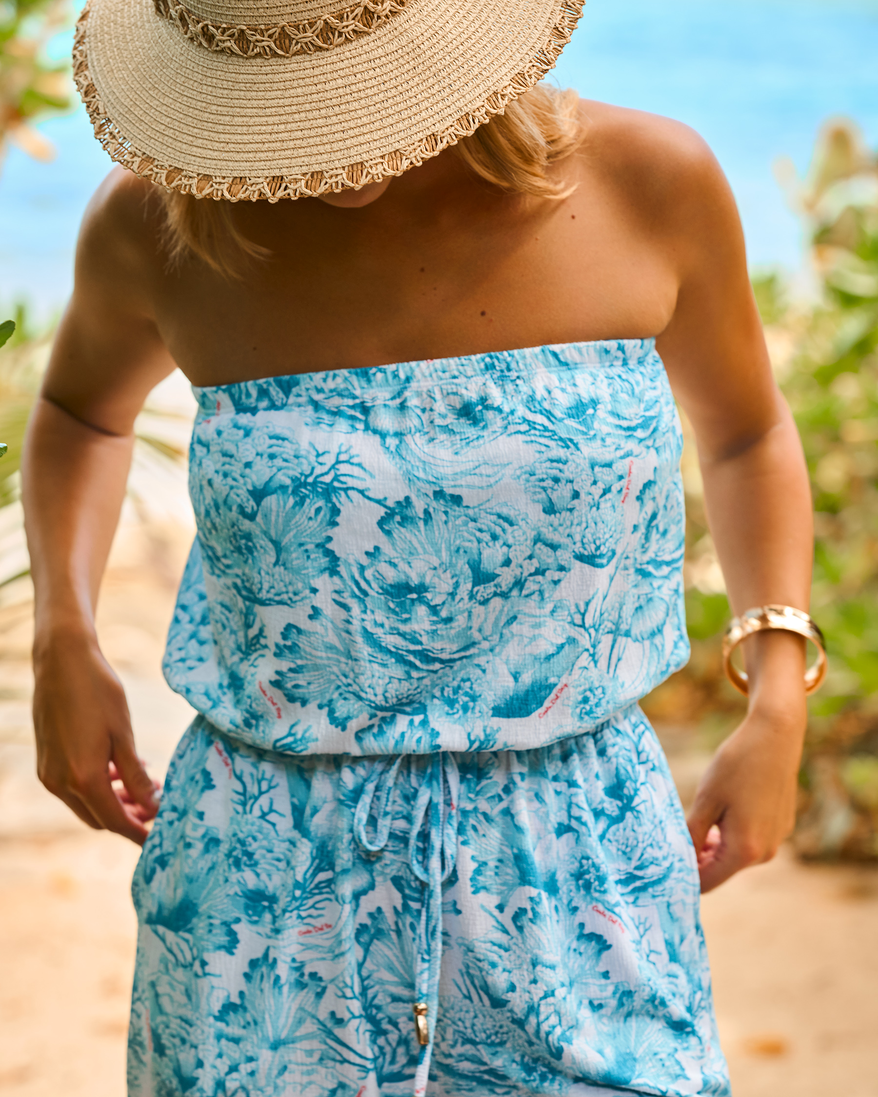 Plongez dans l’élégance solaire de la côte avec la combinaison froissée de Costa Del Ray. Cette pièce sans manches au motif corail, son tissu froissé, léger et texturé est votre passeport pour les rivages dorés et les couchers de soleil inoubliables. Le cordon de serrage à la taille, orné de perles métalliques dorées, souligne la silhouette tout en ajoutant une touche précieuse. Les fentes latérales et les poches subtilement intégrées invitent au confort rendant son design pratique.