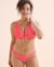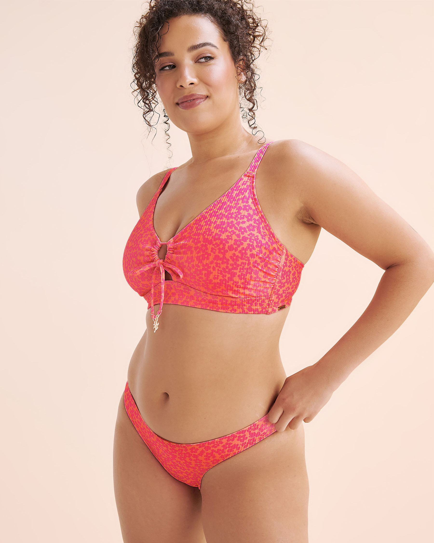 Soleil, fleurs et courbes affirmées. Ce haut de bikini bralette est conçu pour les bonnets D, offrant un maintien optimal sans armatures, grâce à son crochet au dos à 5 rangs, ses bretelles réglables et ses coussinets amovibles. Un nœud ouvert sur le devant laisse subtilement entrevoir la peau, orné de breloques argentées en forme de palmier et d’étoile de mer. Ajoute à ça des fronces délicates sur les côtés, un tissu côtelé et un imprimé floral rose et orange vibrant et tu obtiens un cocktail vitaminé. Coquin, coloré, douillet : ce haut t’accompagnera dans toutes tes sorties.