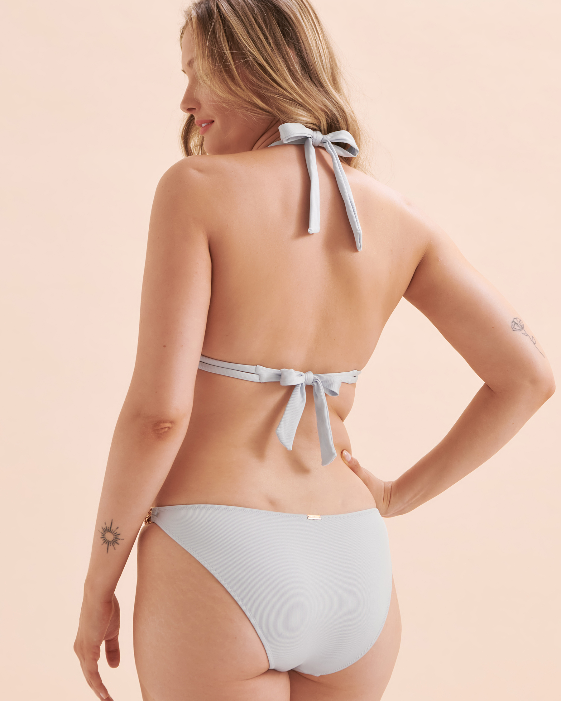 Il est temps de profiter du soleil avec style! Ce haut de bikini triangle bleu pâle avec un décolleté plongeant flatteur et des chaînes dorées scintillantes vous procurera un look élégant sur le bord de la plage.