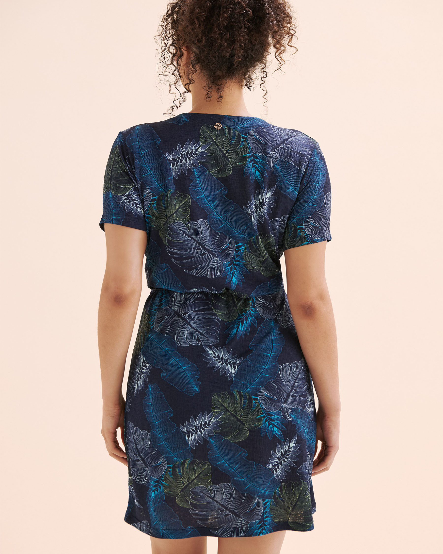 Craquez pour cette robe portefeuille d'une élégance maîtrisée. Son tissu aérien et léger arbore un motif de palmiers bleus, évoquant une invitation au voyage. Le cordon torsadé à la taille, orné de pompons, apporte une touche bohème. Le ruban de suspension aux épaules facilitera aussi son rangement.