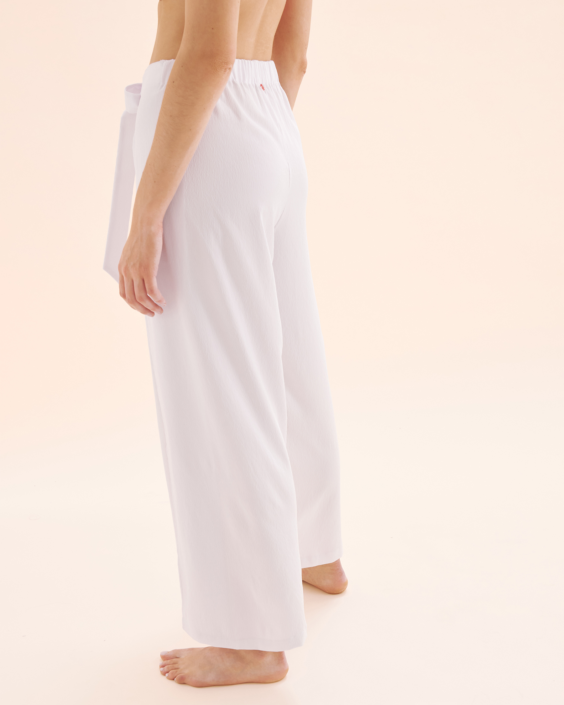 Let the breeze play with your desire for freedom. This wide-leg crinkled crepe pants is an invitation to a sunny stroll. Its fluid cut and textured fabric are both elegant, lightweight and naturally sophisticated. The high waist, combined with the folded back detail that gracefully drapes over the front of the leg, adds a contemporary twist to a timeless classic. This pants wears just as beautifully on the beach as it does in the city, perfectly paired with a bandeau or triangle bikini top for a look as vibrant as you are.