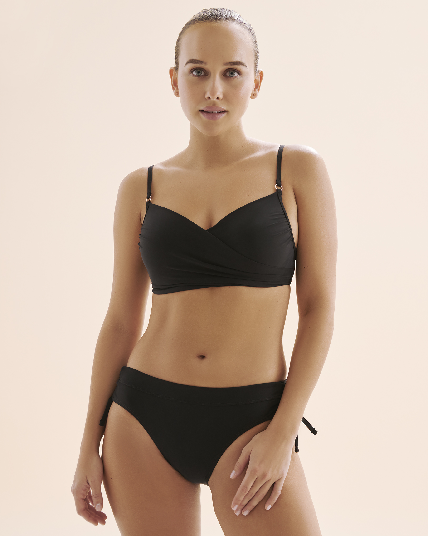 Dive into elegance with confidence in this push-up bikini top. Its design combines subtle underwiring, molded cups and removable padding for a naturally enhanced shape and perfect support. In classic black, fully lined and slightly sculpting, it’s a timeless bikini top for any swimwear wardrobe. The adjustable straps, with two positioning options and rose-gold metal rings, add a refined touch. A crossover front enhances the silhouette, while the five-hook closure ensures a custom fit.