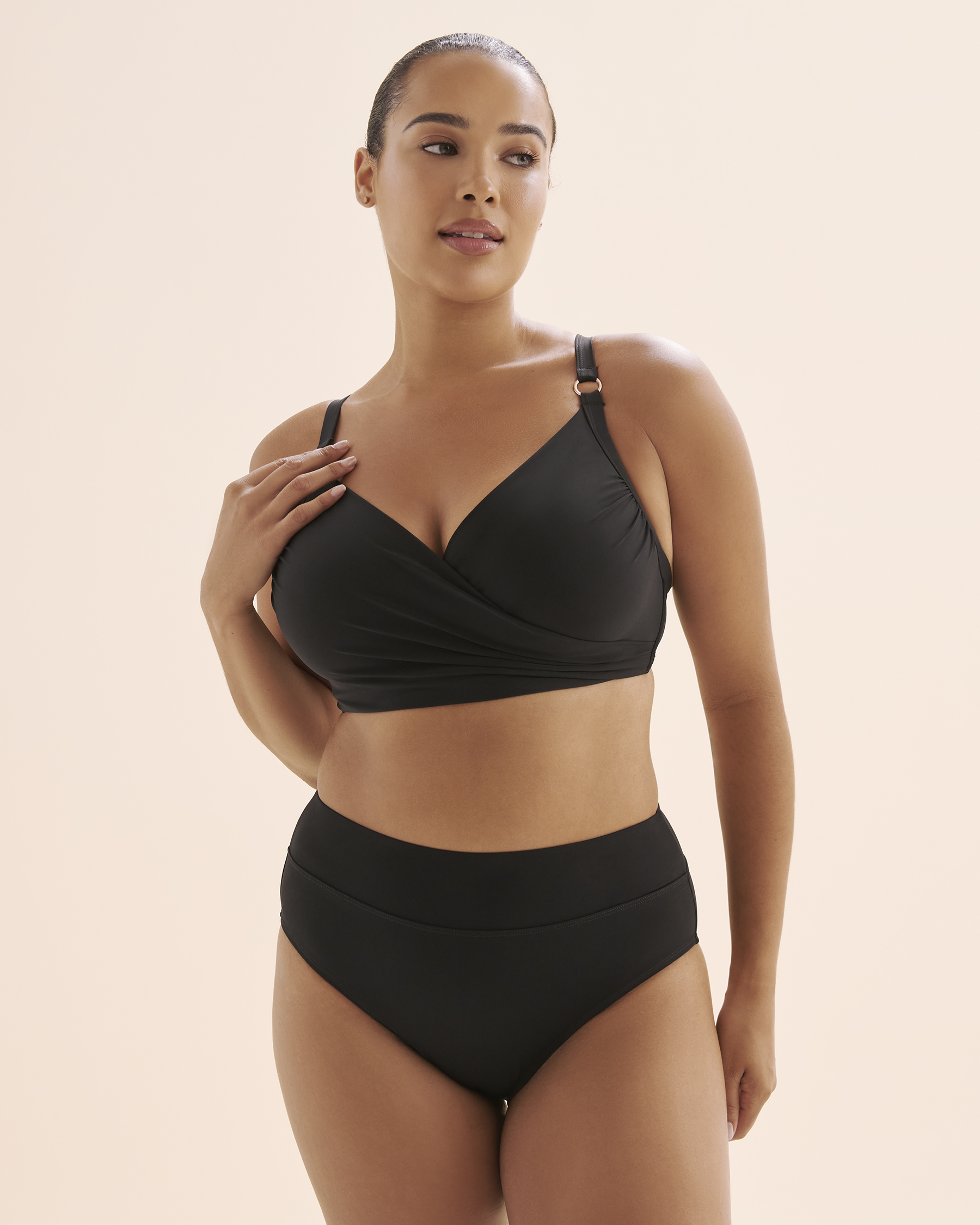 Designed for those who appreciate elegance with a capital E, this plunging D-cup bikini top is crafted to enhance fuller figures with impeccable support. Its molded cups and discreet underwires gently sculpt the bust, while the crossover neckline adds a naturally delicate and flattering shape. Adjustable straps with two positioning options, adorned with rose-toned metal rings, offer a subtle touch of shine and the five-hook back closure ensures a secure, custom fit. In classic black, this bikini top perfectly captures the refined signature of Turquoise Couture: mature elegance, a beautifully enhanced silhouette and timeless style.