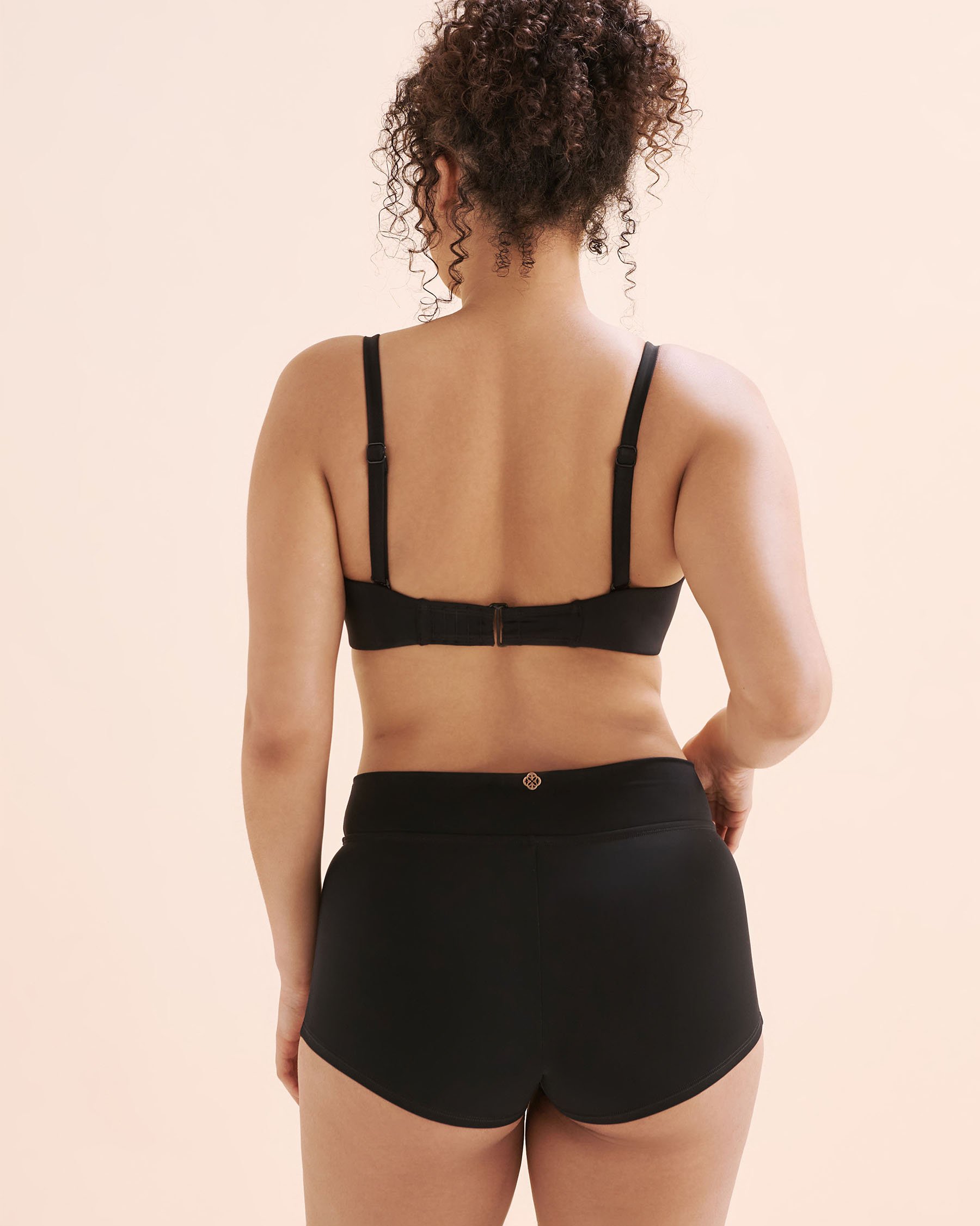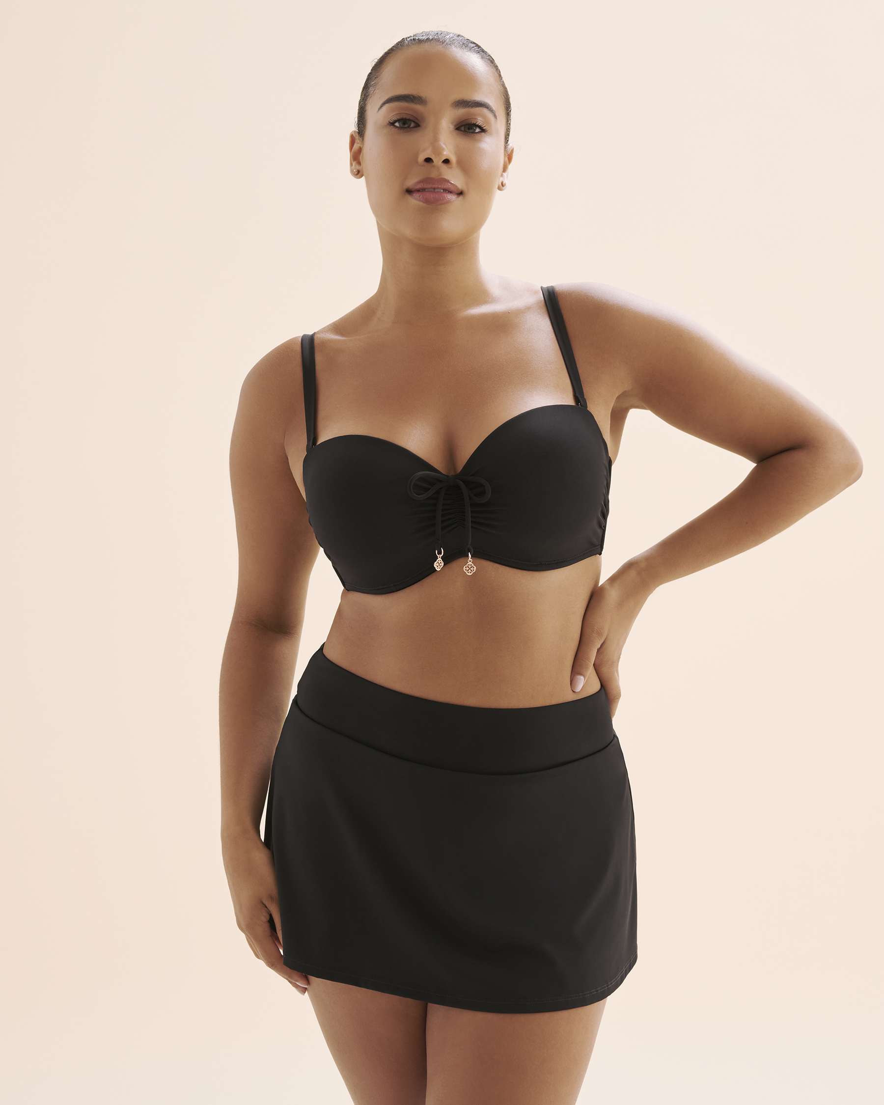 Make a statement with this bandeau bikini top in a D cup. Its delicately gathered knot at the front and refined finishes make it both flattering and elegant. Designed to enhance fuller busts, it offers impeccable support thanks to its molded cups and removable, adjustable straps. The five-hook back closure ensures a custom fit while perfectly embodying the brand’s timeless yet contemporary style. Pair it with a skirt-short style bikini bottom for a chic and relaxed beach look.
