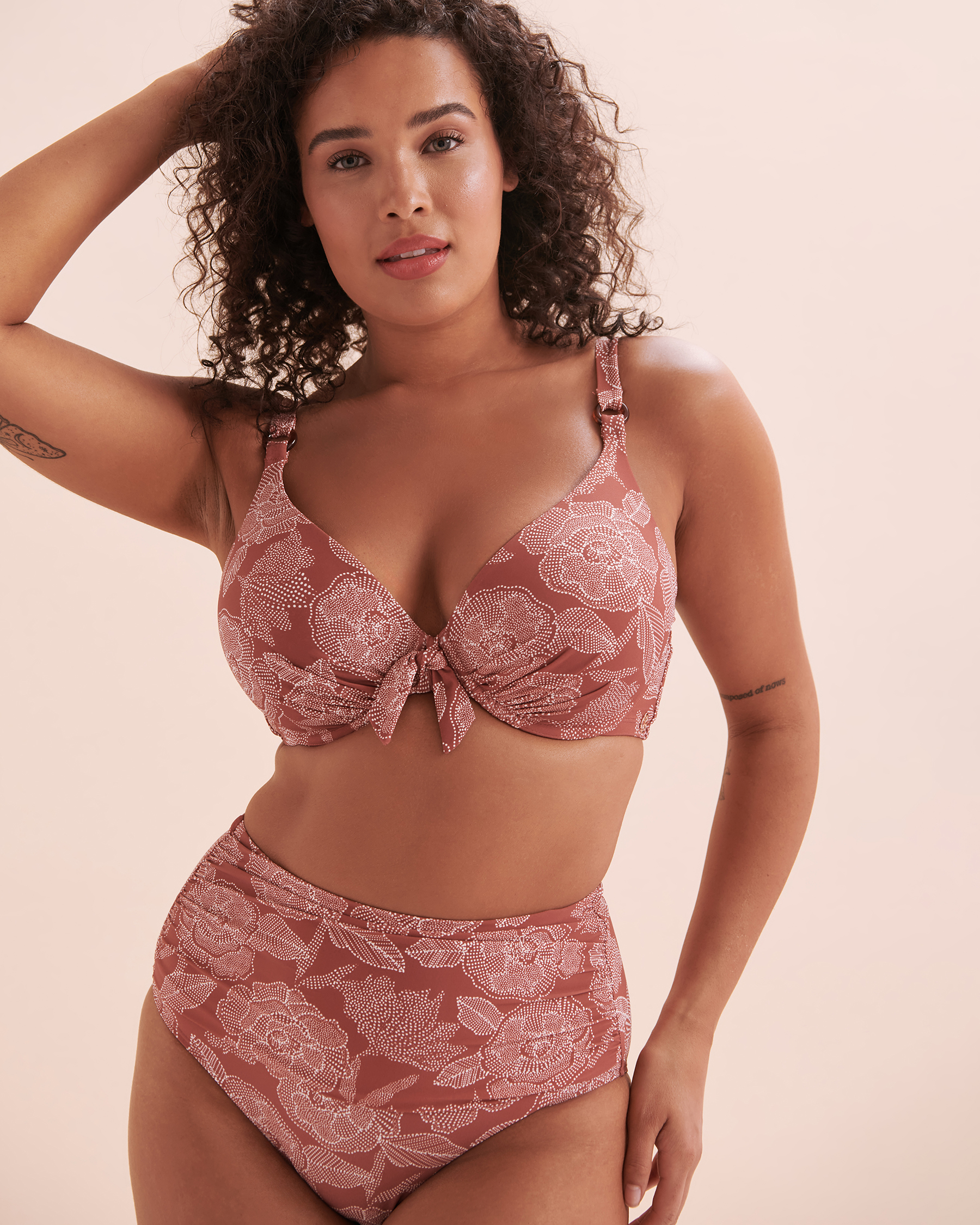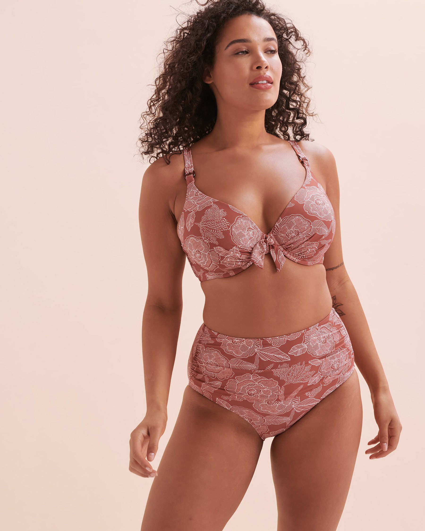 Turquoise Couture's D Plunge Marsala Bikini Top is your dream swimsuit! This floral top has a front knot and two-way adjustable straps. Its underwire and moulded cups are perfect for those who want a little extra support. You won't want to take it off! Complete the look with Turquoise Couture's High Bikini Marsala bikini bottom.